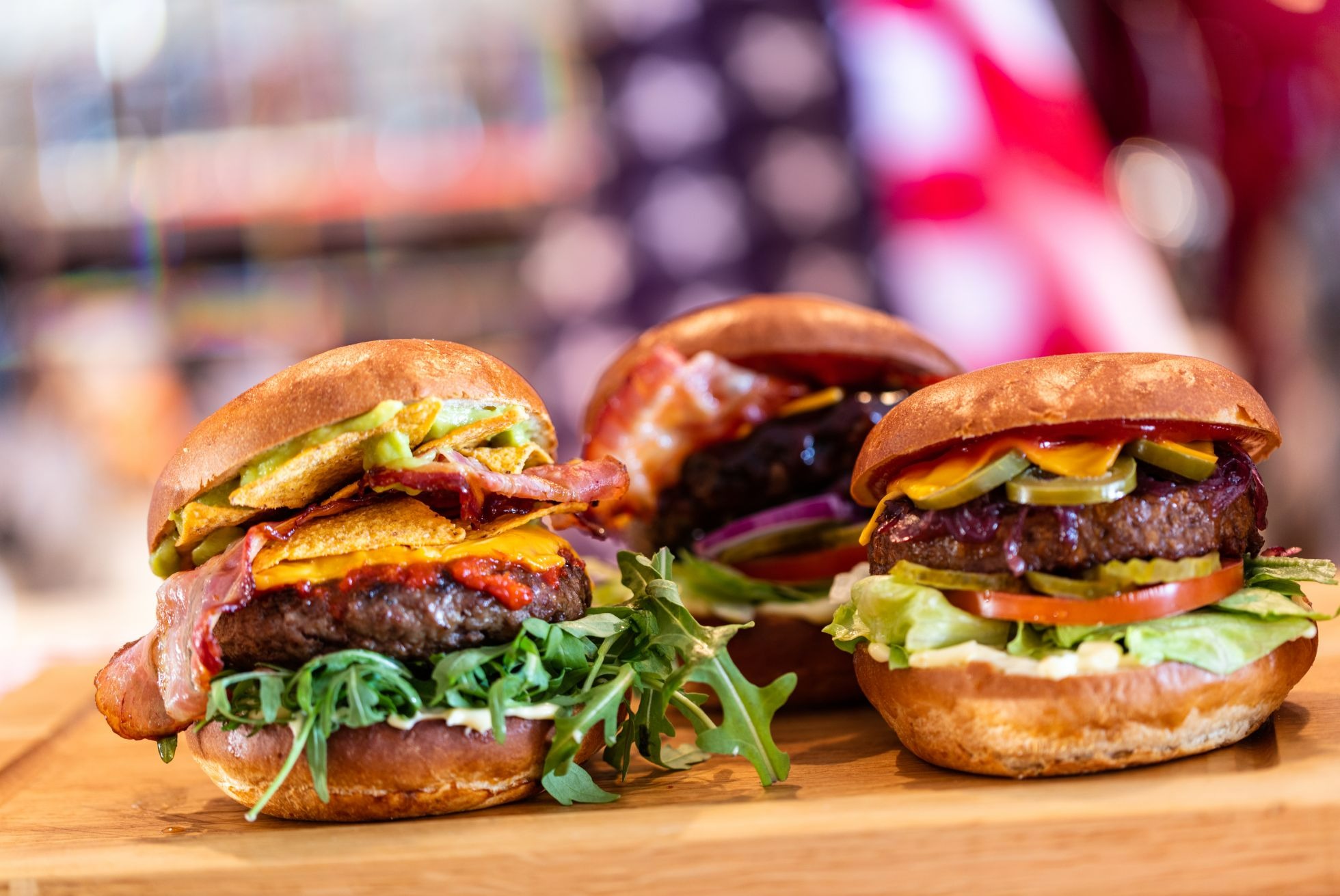 wołowina 200g lub drób 200g, bekon, ser cheddar, sałata lodowa, pomidor, ogórek konserwowy, czerwona cebula, sos do wyboru -